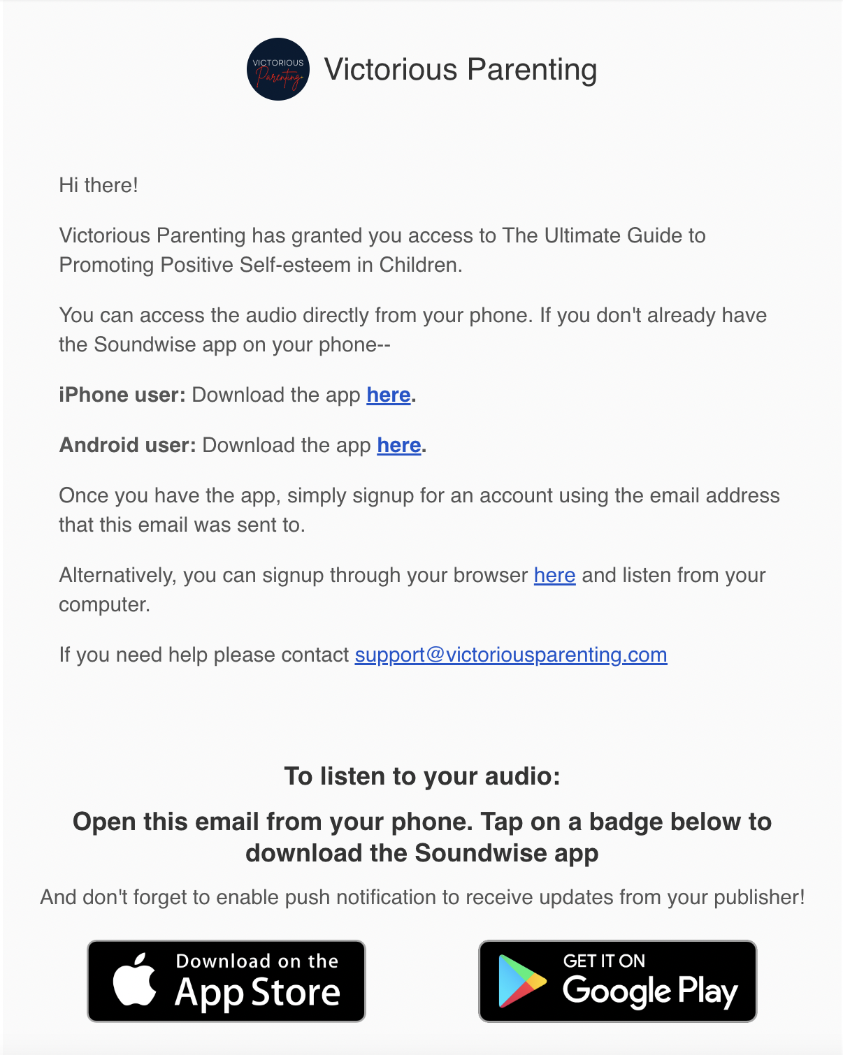 You've automatically been granted access to the audiobook, and a separate email with detailed instructions has been sent from Victorious Parenting. If you cannot find it in your inbox, please use the search bar and enter hello@victoriousparenting.com.